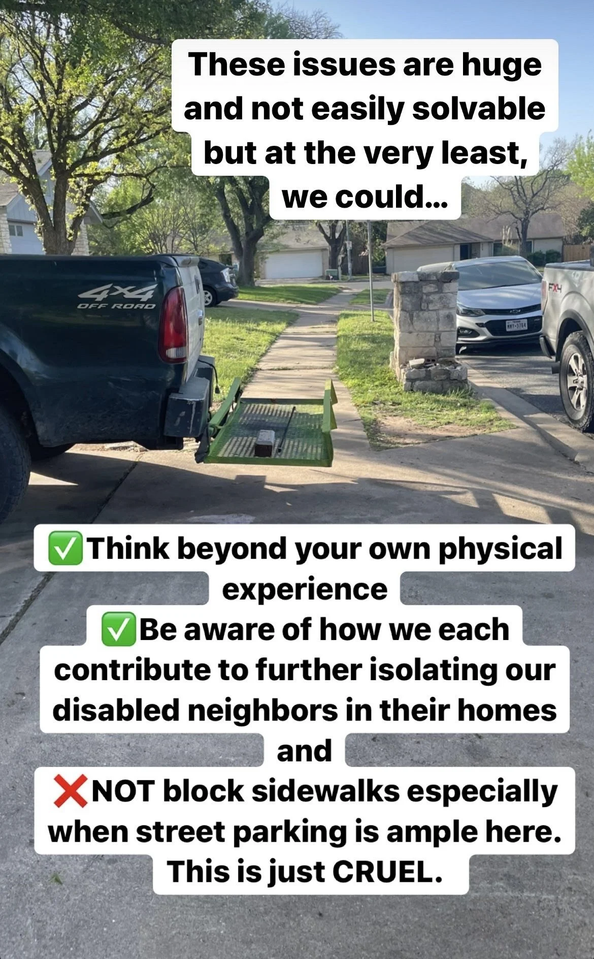 In the process, I have become much more intimately familiar with my neighborhood from an up close perspective that driving doesn't allow. I've grown increasing disturbed by how so many of my neighbors are repeatedly and flagrantly contributing to accessibility issues for disabled people who also live here, undoubtedly leading to challenges, frustrations, and greater isolation. While my current neighborhood is in south Austin, TX I know that there are neighborhoods just like mine all across the country...I grew up in one in Indiana. I've personally seen them in Colorado, California, New York, Illinois, and New Jersey.
